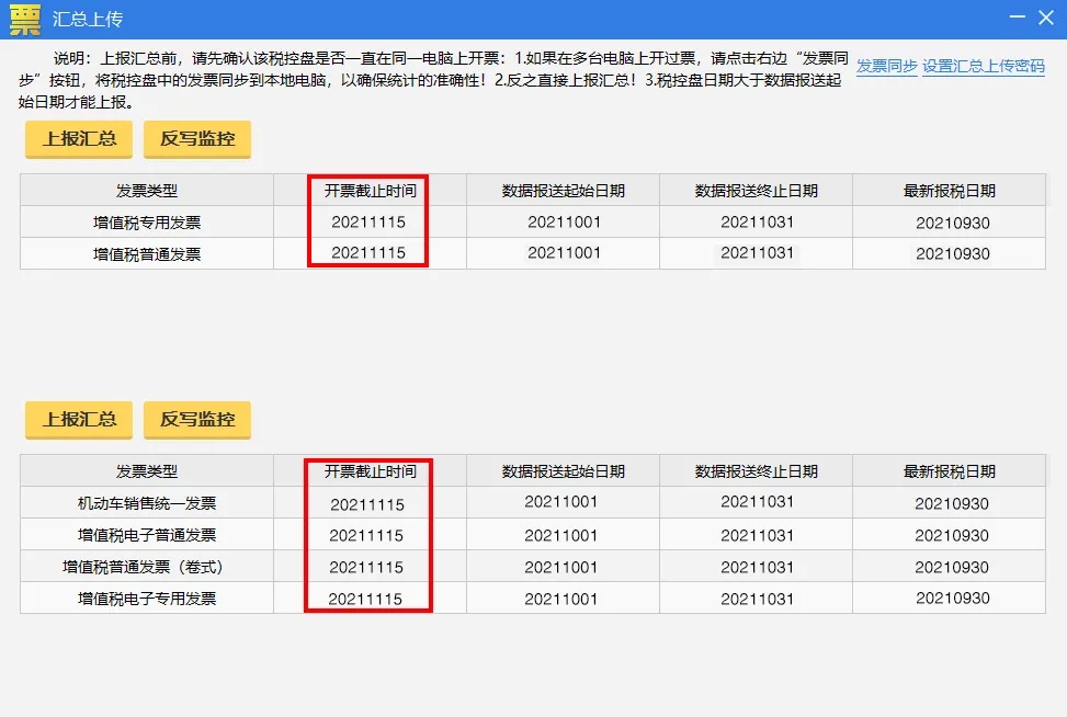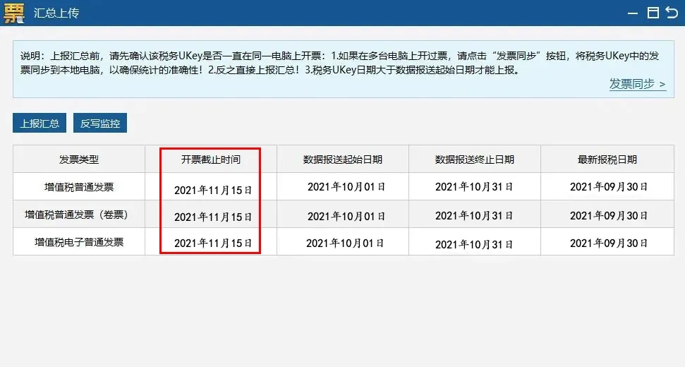 操作流程:重新打開(kāi)匯總上傳界面,查看各發(fā)票類(lèi)型開(kāi)票截止時(shí)間是否更新到下月中旬,若更新,說(shuō)明操作成功。